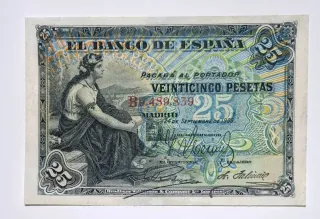 Bonito billete de 25 Pesetas de 1906 Serie B948 Leve restauracion Mas billetes en mi perfil. Hago descuentos por lote de billetes. Hagos envios Walapop. Hago envios Certificados y ordinario con tarifas de correos. No leer: Notafilia Billetes Billete Españoles España Republica Burgos Estado Español Franco Juan Carlos I Rey Alfonso XII Gobierno provisional filatelia Coleccionismo pesetas peseta antigua antiguo