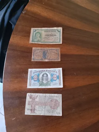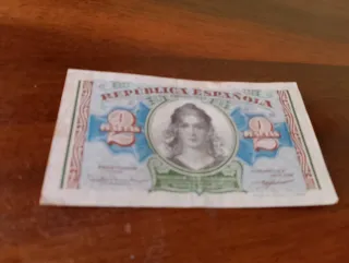 Conjunto de billetes antiguos españoles. - Banco de España, Cinco Pesetas. - República Española, 2 Pesetas. - República Española, 1 Peseta.