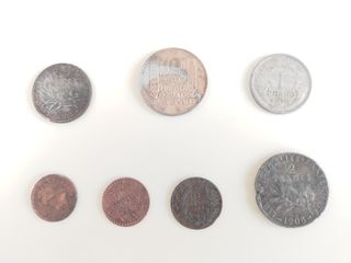 Colección de monedas francesas antiguas. Son piezas con señales de uso, algunas muestran desgaste. - Incluye 7 monedas francesas antiguas de diferentes valores y años. - Monedas de diferentes metales y tamaños.