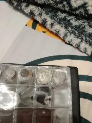 Conjunto de varias monedas antiguas, cada una protegida individualmente. - Monedas de diferentes valores y épocas. - Presentadas en carpetas protectoras. - Ideales para coleccionistas.