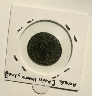 Moneda antigua de origen romano. Presenta un diseño detallado en su anverso y reverso. - Material: Metal (apariencia antigua). - Diseño: Rostro imperial y leyendas. - Estado: Desgaste propio de su antigüedad.