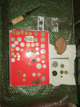 Conjunto de antigüedades variadas, ideal para coleccionistas. -Monedas, más información por chat. - Incluye un lote de monedas antiguas. - D con mango de hueso. - Fósil de aspecto único. - Pieza de metal de color oscuro.50 euros x Todo. No Negociable.