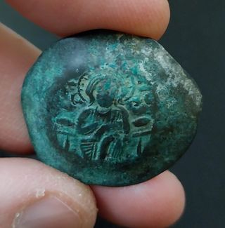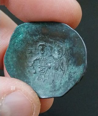 Moneda antigua de bronce, aspron trachy de Manuel I Commeno. Bonita patina verde. No envío, sólo trato en persona.
