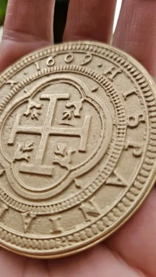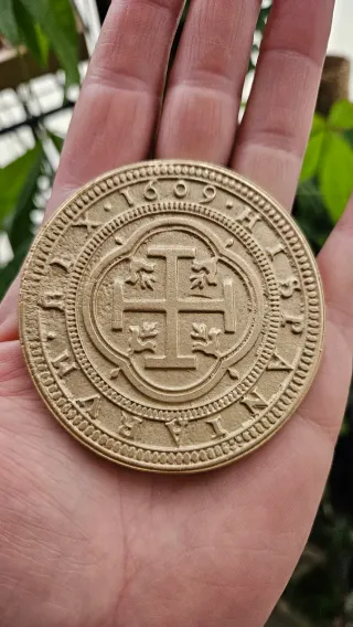 Preciosa Moneda de 100 Reales acuñada en 1609. REPRODUCCION Artesana Aspecto antiguo y detallado Diametro 70 mm Diseño con Cruz de Jerusalén. Inscripción CENTEN SEGOVIANO