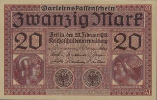 Billetes de 20 marcos alemanes de 1918. - Emitido por la Reichsschuldenverwaltung. - Fecha: 20 de febrero de 1918. - Diseño con retratos y águilas imperiales.