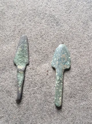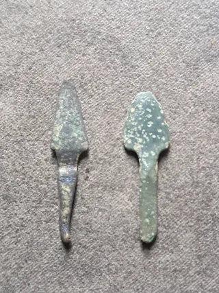 Conjunto de dos puntas de flecha antiguas, con un diseño distintivo y un acabado que sugiere su antigüedad. - Material: Bronce - Color: Verde y grisáceo con pátina. - Forma: Una punta es más alargada y estrecha, la otra es más ancha y con forma de hoja.
