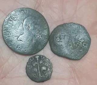 Conjunto de tres monedas antiguas de bronce, con grabados y detalles históricos. - Moneda con perfil y fecha '1814'. - Moneda con diseño circular. - Moneda pequeña con cruz central.