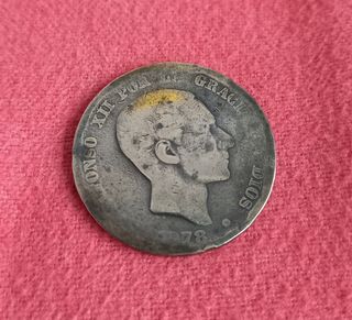 Moneda antigua de cobre, con señales de desgaste por el paso del tiempo. De Alfonso XII. - Presenta una pátina oscura. - Ideal para coleccionistas.