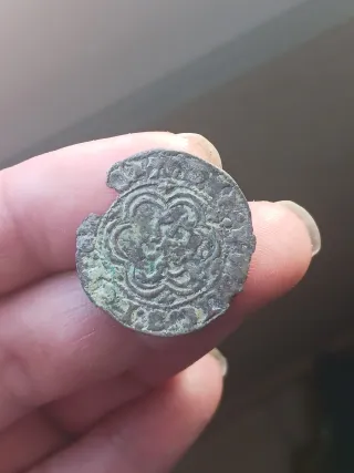 Moneda antigua con diseño detallado. - Material: Metal (posiblemente plata y bronce). - Diseño: Motivo floral central con borde decorado. - Estado: Presenta signos de antigüedad y desgaste, con pátina verde.
