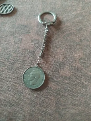 Llavero con una moneda antigua de plata - Moneda con el perfil de Jorge VI. - Inscripción: GEORGIVS VI D.G.BR.OMN.REX. - Cadena y anilla metálicas.