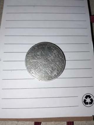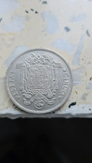 Moneda antigua de 5 pesetas con el escudo de España. - Diseño detallado del escudo. - Borde con greca.