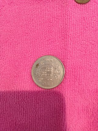3 monedas de 100 pesetas. 2 iguales de 1975 con el escudo por delante y la cara de Juan Carlos I detrás. 1 del 1980 que por delante tiene escudos y "mundial 82" y por detrás a Juan Carlos I En todas en el borde pone " una grande libre"