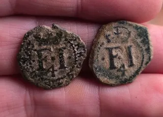 Lote de dos cornados de Navarra, monedas antiguas. - Monedas de bronce. - Inscripción FI y 4 en una de ellas. - Inscripción FI y corona en la otra.