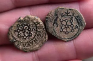 Conjunto de dos monedas antiguas. - Monedas de blancas de los Reyes Católicos. - Procedencia: Sevilla. - Material: Bronce.