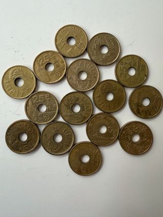 Colección de monedas antiguas de diferentes épocas y orígenes. 2 pesetas de 1984 50 pesetas de 1975 100 pesetas de 1980 25 pesetas de 1975 50 pesetas de 1990 25 centimos de 1937 50 centimos de 1966 1 peseta de 1966 - 2 unidades 1 peseta de 1975 - 2 unidades 25 pesetas de 1997 5 pesetaa de 1996 2 new pence de 1980 (inglaterra) Se aceptan ofertas por el conjunto o por separado