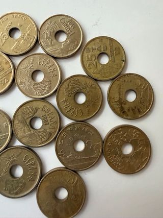 Conjunto de doce monedas antiguas españolas, todas con un característico agujero central. - Monedas conmemorativas y circuladas. - Diseños variados con motivos históricos y culturales. - Algunas presentan inscripciones como ESPAÑA, PTAS, SEVILLA y JUAN CARLOS I. - Años visibles incluyen 92, 1997 y 2000.