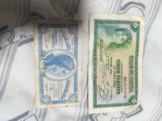 Conjunto de dos billetes antiguos españoles. - Billete de 5 Pesetas del Banco de España, emisión de 1935. - Billete de 50 Céntimos de la República, Ministerio de Hacienda, emisión de 1937.