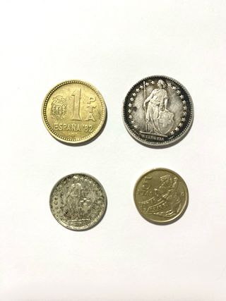 Se venden seis monedas antiguas españolas. Están un poco desgastadas por el tiempo, pero conservan detalles visibles. - Monedas de peseta española. - Algunas muestran señales de uso. - Ideales para coleccionistas.