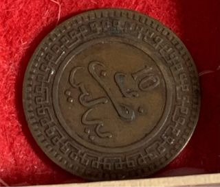 Moneda de 1 Mazuna de Marruecos, año 1320 del calendario islámico (≈ 1902), acuñada en Birmingham. Diseño visible con número central y caligrafía árabe, borde decorativo tipo greca. Pátina antigua con oxidación superficial, ideal para colección numismática o decoración histórica. Se entrega protegida. Precio negociable.