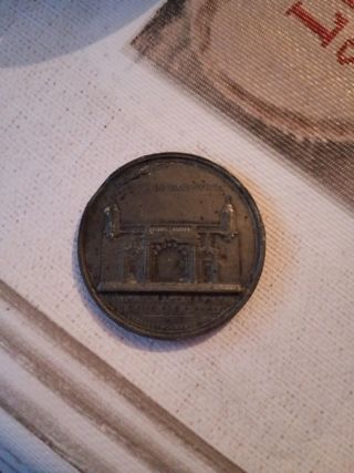 Moneda antigua con grabado de un edificio. - Diseño detallado del edificio. - Borde con inscripciones.