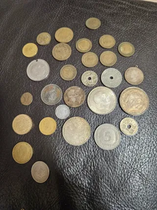 Conjunto de varias monedas antiguas de diferentes países y épocas. - Diseños variados con escudos y retratos. - Ideal para coleccionistas.son monedas de 5 pesetas,25,50,100 ect