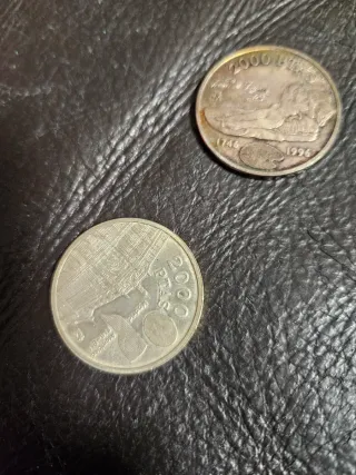 Conjunto de monedas antiguas. - Moneda con perfil y año 1877. - Moneda con figura y año 2000.