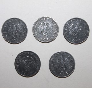 PRECIO NO NEGOCIABLE !!!! Son las 5 monedas las de la foto, en distintos valores, años 1940, 1941, 1942, 1943 y 1944 autenticas y en un buen estado de conservación . Pertenecen a la época del III Reich en la Alemania nazi. . Alemania Nazi .Precio no negociable. - Monedas de 1 Reichsmark. - Años 1940, 1941,1942,1943 y 1944. - Monedas antiguas de colección. Se envía a traves del servico de Wallapop ,por Correos y Itpost.