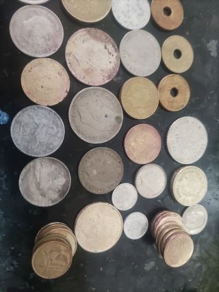 Colección de monedas antiguas, algunas con señales de desgaste por el paso del tiempo. - Se incluyen aproximadamente 30 monedas de diferentes países y épocas. - Variedad de metales y diseños. - Ideal para coleccionistas o aficionados a la numismática. Precio negociable.