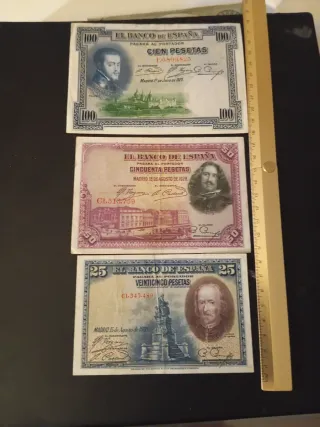 Conjunto de tres billetes antiguos del Banco de España. - Un billete de 100 pesetas con fecha de 1925. - Un billete de 50 pesetas con fecha de 15 de agosto de 1928. - Un billete de 25 pesetas con fecha de 15 de agosto de 1928. Estado usado y circulado con señales evidentes de uso .Ideal para iniciarse en numismática.Precio más que razonable.Tienen un siglo de antigüedad.Se hacen envíos por Wallapop.Se prefiere entrega en Oviedo.