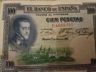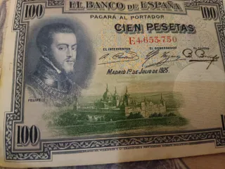 Billete antiguo de 100 pesetas del Banco de España, con fecha de Madrid 1 de julio de 1925. Presenta un retrato de Felipe II y una vista del Monasterio de El Escorial. - Denominación: Cien Pesetas. - Fecha de emisión: 1 de julio de 1925. - Lugar de emisión: Madrid. - Impreso por Bradbury, Wilkinson & Cª, New Malden, Surrey, Inglaterra. Escucho ofertas por todo el lote