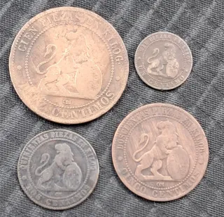 Mas monedas y billetes en el perfil. Se hacen lotes.Conjunto de monedas antiguas del Gobierno Provisional de 1870. - Piezas de colección. - Diseño con figura alegórica y año 1870. Monedas españolas. Monedas antiguas. Colección. Lotes.