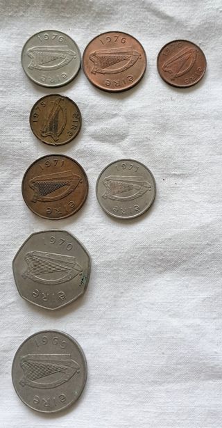 Monedas antiguas irlandesas de libras. Se incluyen 8 monedas en total. Algunas muestran señales de desgaste por el paso del tiempo, pero se encuentran en buen estado general. - Monedas de diferentes años. - Diseño con arpas irlandesas.