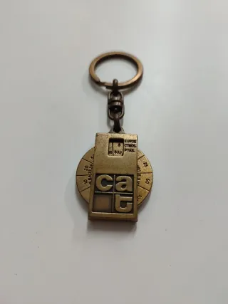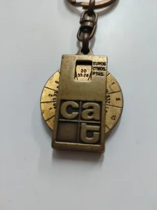 llavero conmemorativo de bronce que funciona como conversor de moneda, específicamente entre euros y pesetas. Este tipo de objeto era popular en España durante la transición a la moneda única europea. - Material: Bronce. - Diseño: Circular con detalles grabados. - Elemento central con las letras cat. - hay más artículos en mi perfil gracias.