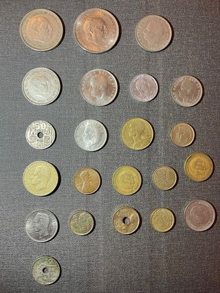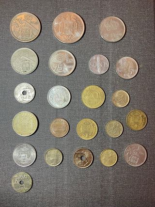 Vendo lote de monedas antiguas. -20 monedas de 5 pesetas (10 de Juan Carlos 1975, 10 de Franco 1957. -20 monedas de 10 céntimos de 1959. -20 monedas de 1 peseta (1953/1975). -45 monedas de 10 céntimos (1940/1953). -8 monedas de 25 céntimos de 1937.