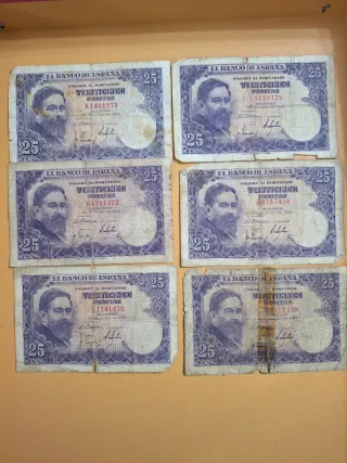 Conjunto de billetes españoles de pesetas, perfectos para coleccionistas. Se venden en un lote completo de seis, Son distintos. estado normal de haber circulado, pero no les falta nungun numero ni imagen. - 2 Billetes de 1000 pesetas. 1 de 100, otro de 25 y 2 de una peseta - Billetes de 100 pesetas. - Billetes de 25 pesetas. - Billetes de 1 peseta.