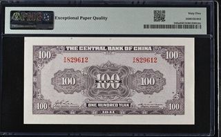 Billete de 100 Yuan del Banco Central de China, emitido en 1941. Certificado por PMG con una calificación de 65 EPQ (Gem Uncirculated). - Pick# 243a - S/M# C300-168 - Número de Serie: I/A 829612 - Impresor: SBNC