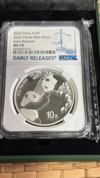 Moneda de plata Panda de China del año 2023, conmemorativa del 40 aniversario. Certificada por NGC con calificación MS70 y en la categoría Early Releases. El TOP. No hay grado más alto !!!!! incluye estuche y certificado. China gold Coin - Peso: 30g - Pureza: Ag.999 - Valor nominal: 10 Yuan