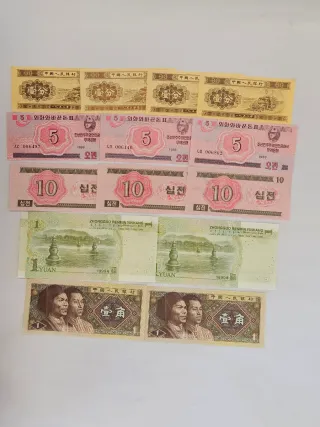 Se vende lote de Lote de 14 billetes de Asia Oriental 🇨🇳🇰🇵 sin circular, de China y Corea del Norte. Incluye yuanes y jiao del Banco Popular de China, junto a billetes norcoreanos de 5 y 10 chon emitidos en 1988. Diseños con retratos tradicionales, templos, camiones y paisajes orientales. Billetes auténticos, en excelente estado, colores vivos y papel limpio. Ideal para colección asiática o numismática mundial. Ref. 585 billetes China Corea Asia colección mundo sin circular numismática oriental coleccionismo regalo billetes de Asia Oriental, incluyendo billetes de China y Corea del Norte.