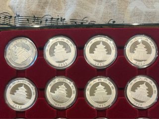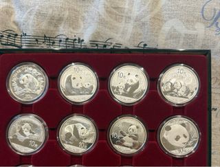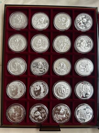 Colección completa de monedas de plata Panda, abarcando todos los años de 1989 a 2025. Cada moneda presenta un diseño único de panda, a excepción del 2001 y 2002 q los hicieron iguales( solo cambia el año) . Una de las colecciones míticas de monedas de onza q todo coleccionista debería de tener. onzas onza oro plata moneda monedas kookaburra libertad Ruanda rwanda coleccionismo escudo escudos real reales china