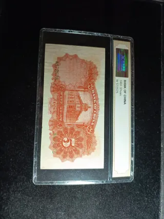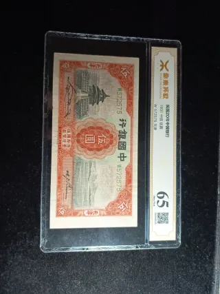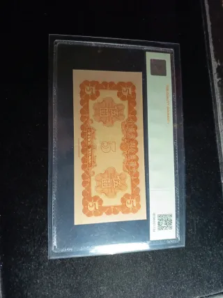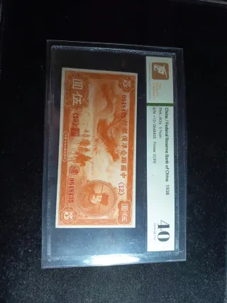Billete de 5 yuanes emitido por el Federal Reserve Bank of China en 1938. Se encuentra en una funda protectora con calificación. - Serie: J62a - Número de serie: <12> 0648435 - Calificación: 40 (Extremely Fine) - Impresor: ECPO