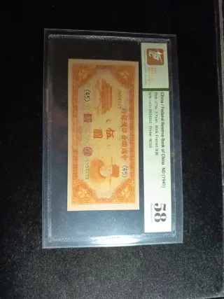 Billete de 5 Yuanes de la Reserva Federal de China, emitido en 1941. Certificado por PMG con una calificación de 40 (Extremely Fine). - País: China - Banco: Federal Reserve Bank of China - Año: ND (1941) - Denominación: 5 Yuan - Calificación PMG: 40 Extremely Fine - Número de Serie: 0557423 - Bloque: 45 - Impresor: NCGA