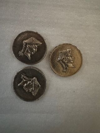 Conjunto de tres monedas antiguas chinas con inscripciones. - Diseño tradicional. - Material metálico. -600€ cada una, si llevas las tres 1500€ -Miden 2 cm