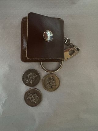Conjunto de llavero con una pequeña bolsita de cuero y tres monedas. - Bolsita de cuero con cierre de botón. - Tres monedas para jugar a los chinos.