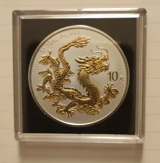 Moneda conmemorativa de China con diseño de dragón dorado, primera moneda de China Dragón de la colección. - Edición Dragón dorado. - Peso: 31.104 gramos. - Pureza: Plata 99.9% (Ag.999). - Valor nominal: 10 Yuan. - Con certificado de Autenticidad.