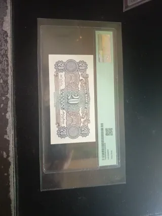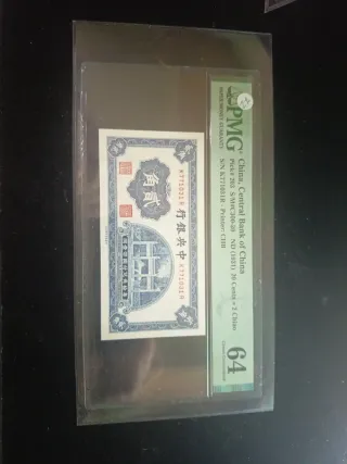Billete de 2 Chiao del Banco Central de China, emitido en 1931. Certificado por PMG con una calificación de 64. - País: China - Banco: Central Bank of China - Año: ND (1931) - Denominación: 20 Cents = 2 Chiao - Número de catálogo Pick: 203 - Serie: K771031R - Calificación PMG: 64 Choice Uncirculated