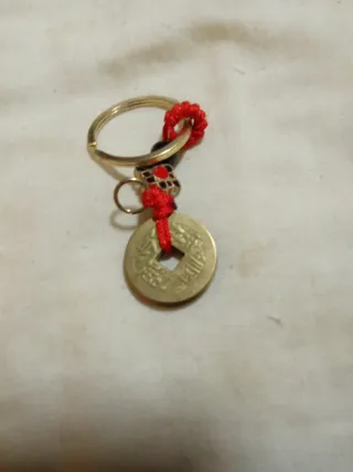 Llavero con una moneda china y un nudo de la suerte, ideal para dar un toque especial. - Moneda de estilo chino. - Nudo de la suerte en hilo rojo. - Anilla metálica para llaves.