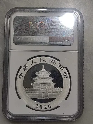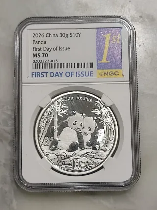 Moneda de plata Panda de China del año 2026, con un peso de 30 gramos y pureza Ag.999. Certificada por NGC como MS70 y First Day of Issue. - Año: 2026 - País: China - Denominación: 10 Yuan - Peso: 30g - Pureza: Ag.999 - Grado: MS70 - Sello: First Day of Issue