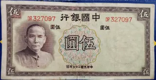 Billete de 5 yuanes de la República de China, emitido en 1937. - Diseño con retrato. - Serie DR 327097. - Inscripción Banco Central de China.