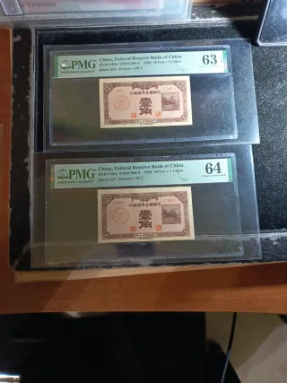 Se venden dos billetes del Banco Federal de China. - Billetes de 10 Fen / 1 Chiao. - Año 1938. - Grado 63 y 64 de PMG. - Pick J45a S/M#C286-4.