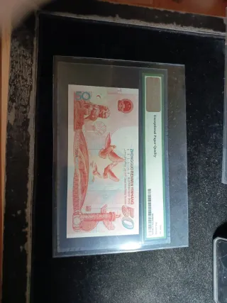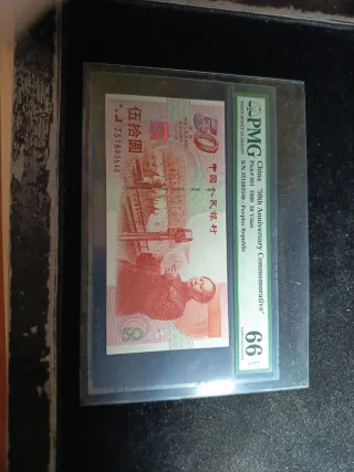 Billete conmemorativo del 50 aniversario de la República Popular China. - Denominación: 50 Yuan. - Año: 1999. - Grado de certificación PMG: 66 Gem Uncirculated. - Número de Pick: 891. - Número de serie: J31893540.
